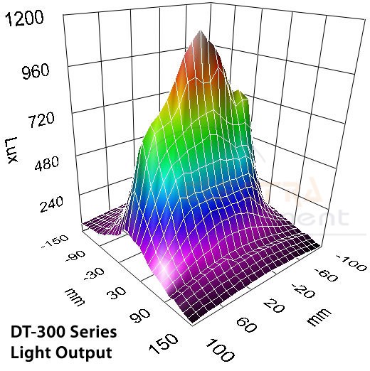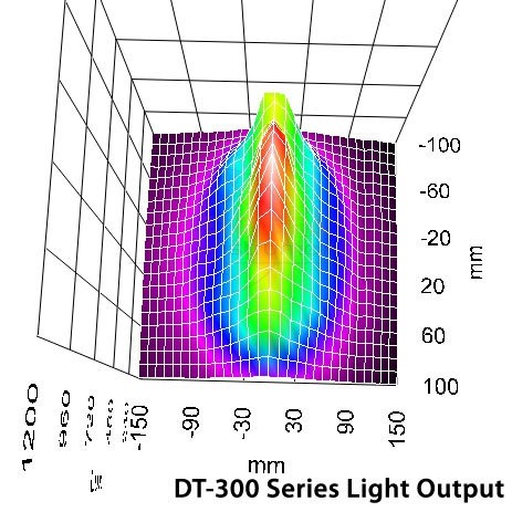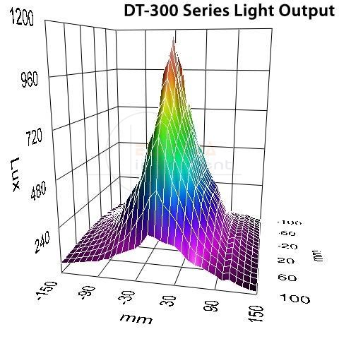 Hard plastic carrying case with custom molded insert allows for safe storage and easy transportation. Provides storage space for the DT-315A, AC adapter, and accessories.Light Output (LUX) vs Distance