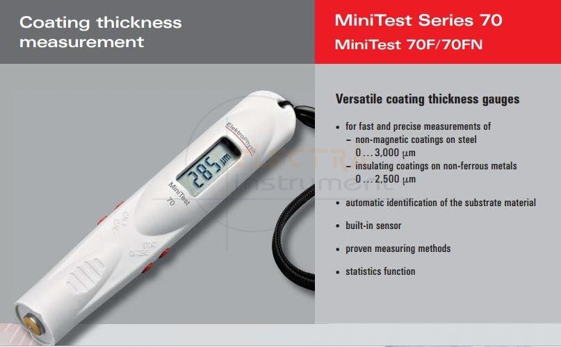 The MiniTest 70 is a pocket sized, versatile and accurate thickness gauge with built-in sensor. Especially designed for easy operation, this gauge is the ideal tool to measure any non-magnetic coatings on steel and/or any insulating layers on non-ferrous metals.